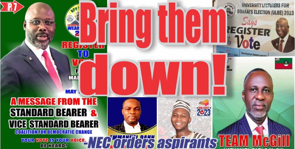 In contravention of the elections law, aspirants across the country, including incumbent President George MannehWeah have billboards, posters, banners and flyers with their photographs erected across Monrovia and other parts of the country, calling on citizens to go and register to participate in the ensuing October’s elections.