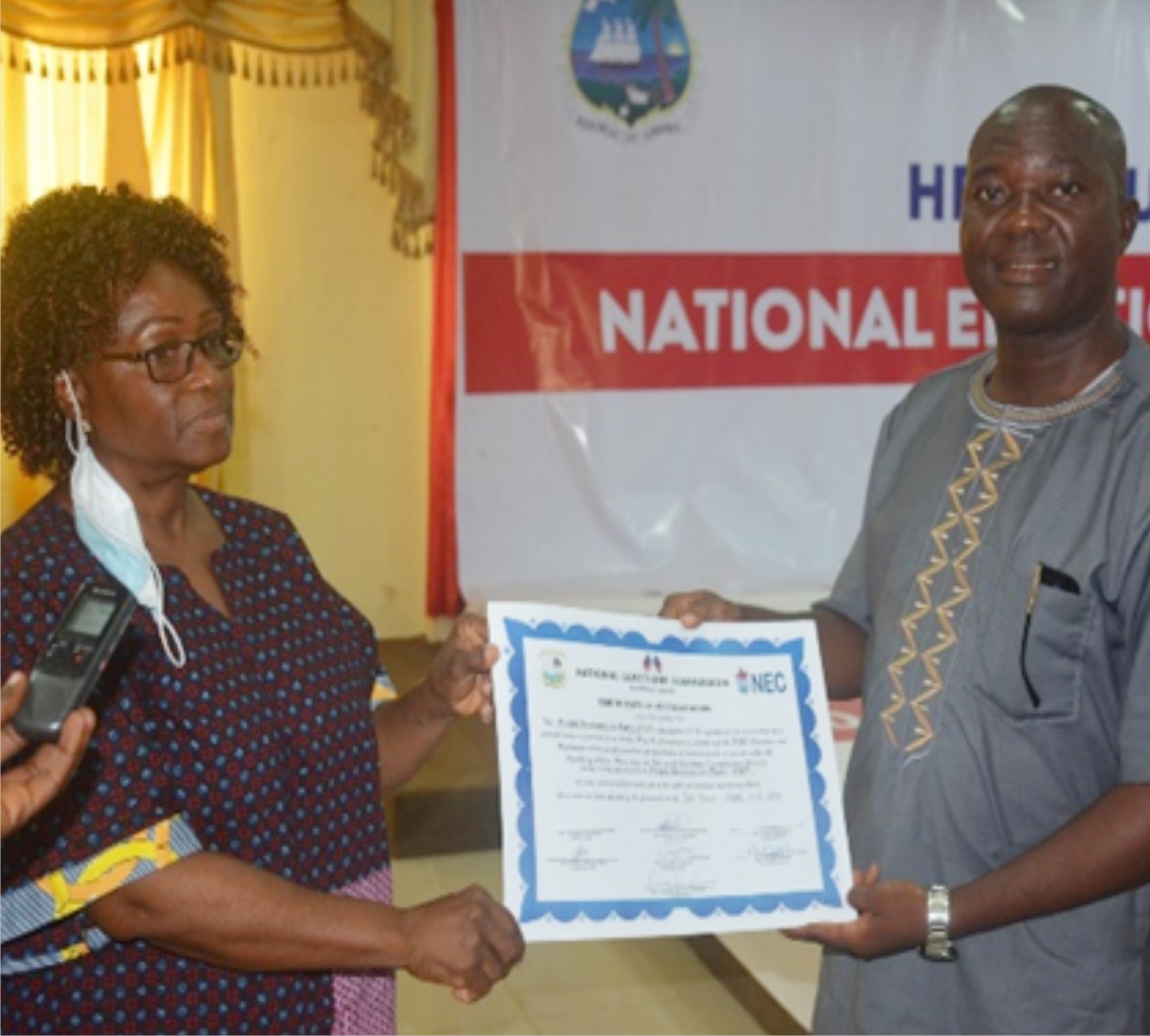NEC Boss presents Election Certificate to PRP Organizing Committee Chairperson, Richmond Yarkpah.