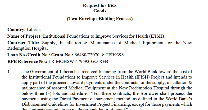 - The Government of Liberia has received financing from the World Bank toward the cost of the Institutional Foundations to Improve Services in Health (IFISH) Project and intends to apply part of the proceeds toward payments under the contracts for the supply, installation & maintenance of assorted Medical Equipment at the New Redemption Hospital through the below three (3) lots and schedules. “For these contracts, the Borrower shall process the payments using the Direct Payment disbursement method, as defined in the World Bank’s Disbursement Guidelines for Investment Project Financing, except for those payments which the contracts provide to be made through letter of credit.”