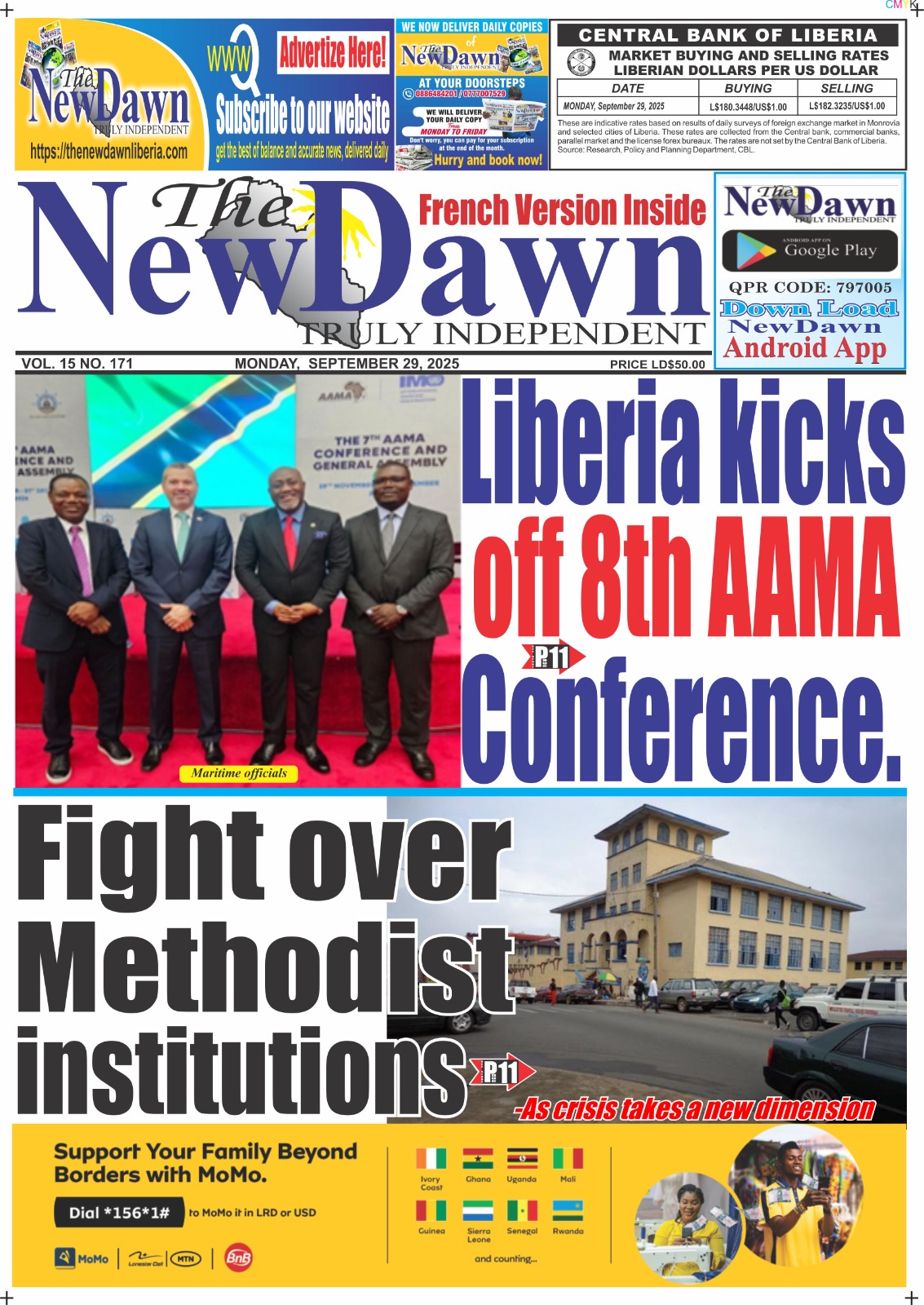 Home/Pdf/Vol.15 No. 171 MONDAY, SEPTEMBER 29, 2025 GeneralLiberia newsPdf Vol.15 No. 171 MONDAY, SEPTEMBER 29, 2025 New Dawn Send an email September 29, 20250 Less than a minute Facebook X LinkedIn Tumblr Odnoklassniki Skype Messenger Messenger Viber Share via Email Print Vol.15 No. 171 MONDAY, SEPTEMBER 29, 2025Download New Dawn Send an email September 29, 20250 Less than a minute Facebook X LinkedIn Tumblr Odnoklassniki Skype Messenger Messenger Viber Share via Email Print Show More