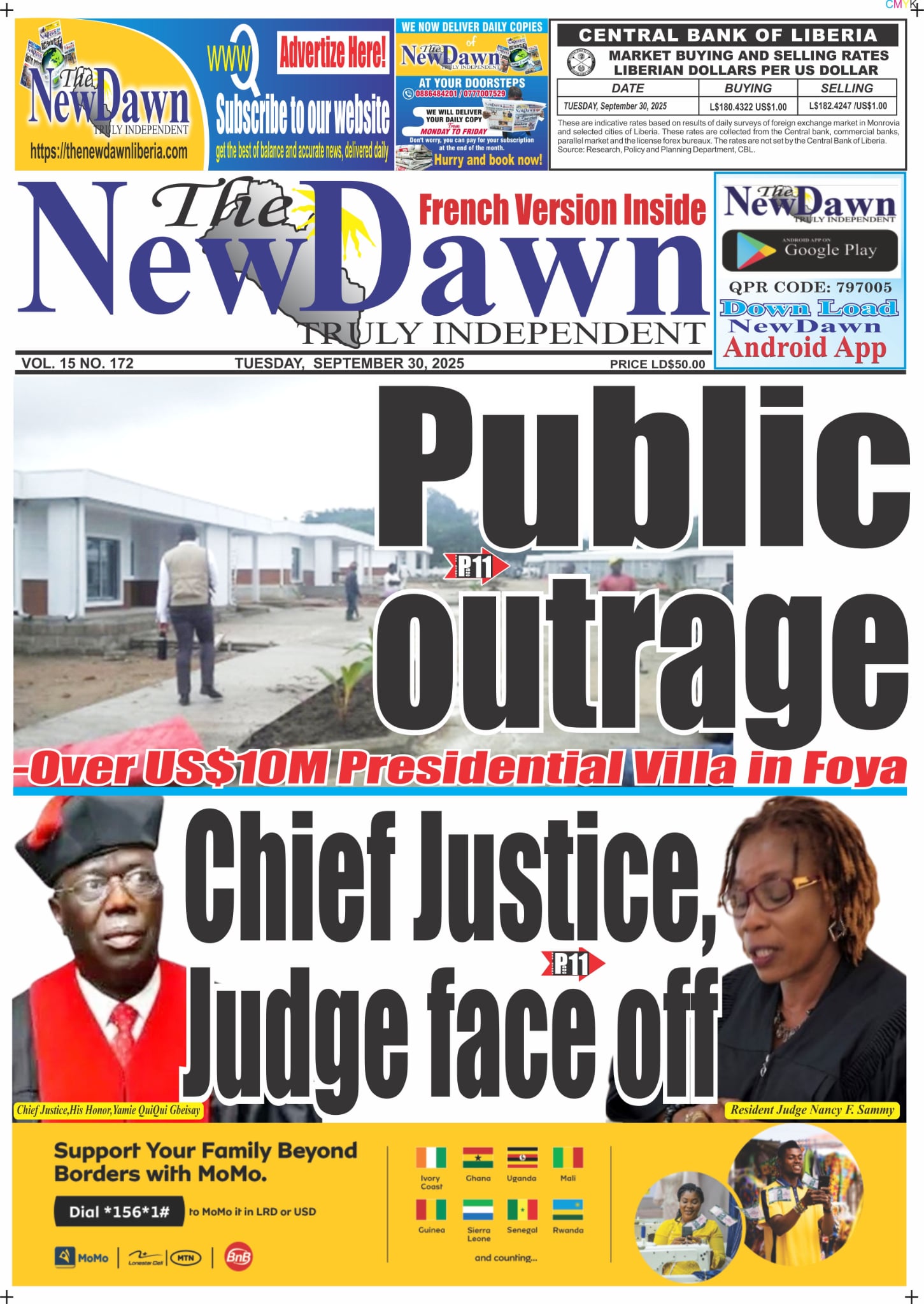 Home/General/Vol.15 No. 172 TUESDAY, SEPTEMBER 30, 2025 GeneralLiberia newsPdf Vol.15 No. 172 TUESDAY, SEPTEMBER 30, 2025 New Dawn Send an email September 30, 20250 Less than a minute Facebook X LinkedIn Tumblr Odnoklassniki Skype Messenger Messenger Viber Share via Email Print Vol.15 No. 172 TUESDAY, SEPTEMBER 30, 2025Download New Dawn Send an email September 30, 20250 Less than a minute Facebook X LinkedIn Tumblr Odnoklassniki Skype Messenger Messenger Viber Share via Email Print Show More